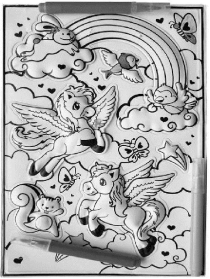 Set olarak paketlenmiş olan ürün aşağıdaki bileşenlerden oluşur: - İki katlı plastik filmden yapılmış, ön yüzünde siyah-beyaz desenlerin basılı olduğu, dikdörtgen şeklinde çıkartma tablası (yaklaşık 14x21 cm ölçülerinde): Ürünün arka yüzü kendinden yapışkanlıdır ve üzerinde kesilecek yerleri önceden yarı-kesilerek belirlenmiş olan altı adet kabartmalı çıkartma bulunur. Bu 6 adet kabartmalı (ürünün üst katmanını oluşturan plastik film kabartılarak elde edilmiş olan) çıkartma, tabladan kopartılabilmektedir. - Farklı renklerde üç adet gözenekli uçlu keçeli kalem: kalemler küçük bir plastik ambalaj içinde birlikte paketlenmiştir. Çıkartmalar, keçeli kalemlerle boyanarak dekoratif amaçlarla kullanılmak üzere tasarlanmıştır. (*)