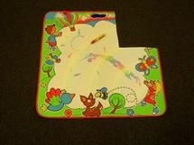Perakende satışa hazır haldeki eşya, bir mat ve özel bir kalemden oluşur. Dörtgen şekilli matın tekstil kumaştan mamul iki katmanı, tüm kenarları boyunca bastırılmak suretiyle birbirine birleştirilmiş haldedir. Üst katman tekstil liflerden dokunmuş kumaştan oluşur ve kenarlarında çizgi film karakterlerine benzeyen resimlerden oluşan baskılar mevcuttur. Üst yüzeydeki renkli baskıların orta kısmı beyaz bir kimyasal maddeyle kaplanmıştır ve bu kısım ıslatıldığında şeffaflaştığından kumaşın altındaki renkli baskılar görünür hale gelmektedir. Örneğin bu yüzeye ıslak parmakla dokunulduğunda, parmak hareketleri yüzeyde renkli izler oluşturmaktadır. Söz konusu tekstil malzeme kuruduğunda renkli izler yok olmakta ve beyaz yüzey tekrar elde edilmektedir. Plastikten mamul özel kalem de ıslak ucu ile söz konusu kaplanmış yüzeyi ıslatarak yazı yazmakta (çizim yapmakta) kullanılmaktadır. Söz konusu kalem boşaldıkça yeniden suyla doldurularak kullanılır. (*)